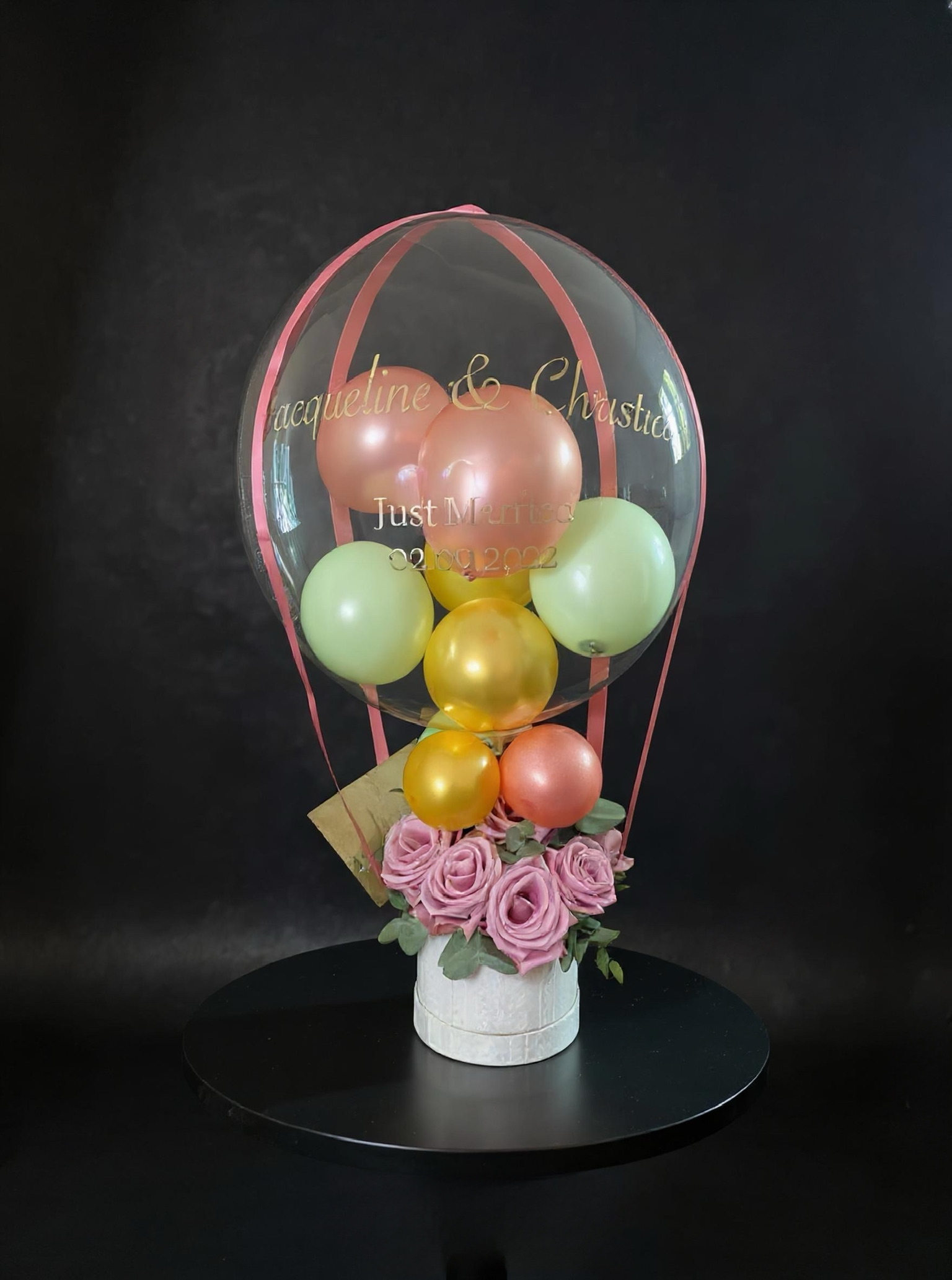 Mit Namen und Datum in goldener Schrift, harmonischen Pastellballons und einer stilvollen Blumenbasis.